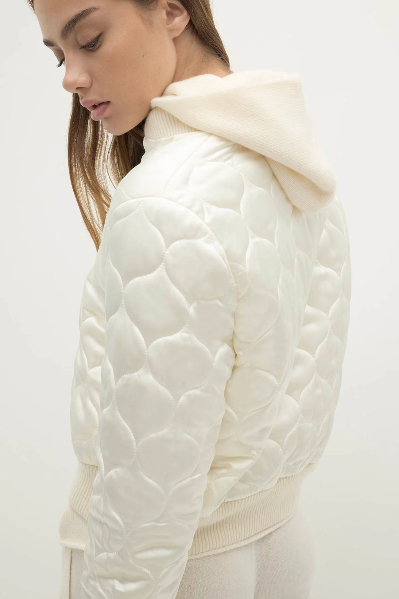The Becca Silk Bomber Jacket is a luxurious take on a classic style. Made from 100% Silk with a quilted pattern throughout. Its reversible design offers versatile wear, while the button-front closure and bomber style add a trendy edge.